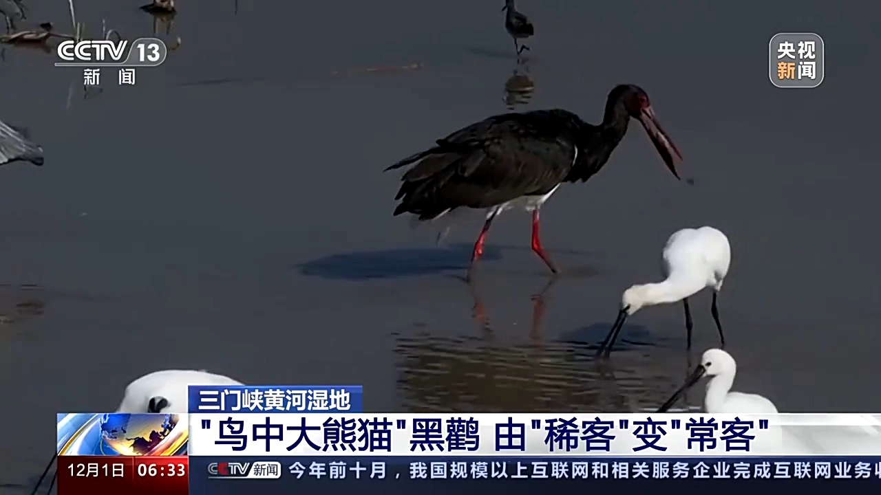 河南黃河濕地國家級自然保護(hù)區(qū)三門峽事務(wù)中心科研人員 董睿龍:它對環(huán)境比較挑剔,主要棲息在河流、沼澤、草灘等淺水區(qū)域。近兩年,通過GPS定位技術(shù)以及人工調(diào)查,發(fā)現(xiàn)一年四季都有黑鸛的身影。