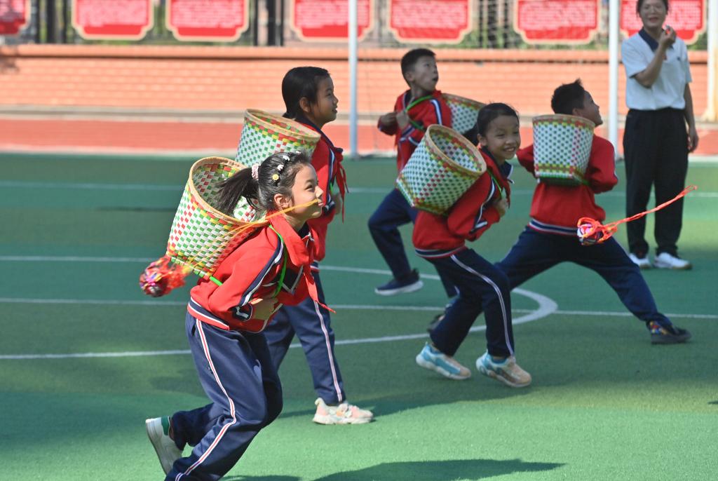 10月16日,在廣西梧州市長(zhǎng)洲區(qū)龍平小學(xué),學(xué)生們?cè)隗w育課上進(jìn)行拋繡球比賽。新華社記者 黃孝邦 攝