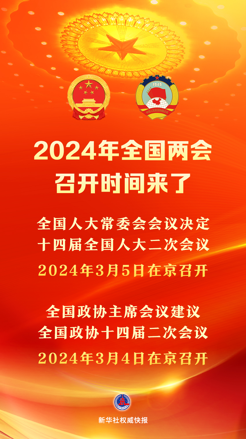 新華社北京12月29日電 十四屆全國人大常委會(huì)第七次會(huì)議29日表決通過了關(guān)于召開十四屆全國人大二次會(huì)議的決定。根據(jù)決定,十四屆全國人大二次會(huì)議將于2024年3月5日在北京召開。