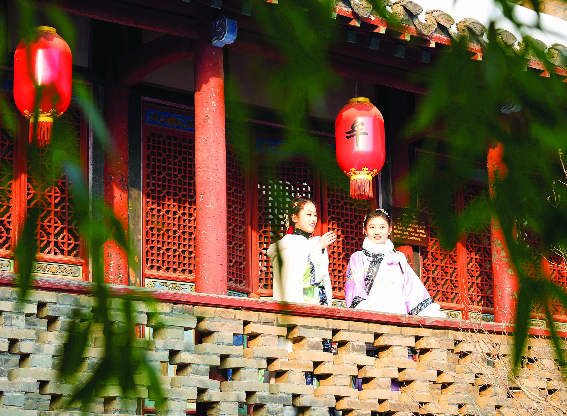 棲霞市牟氏莊園,穿復(fù)古裝的女孩在庭院里竊竊私語(yǔ)。