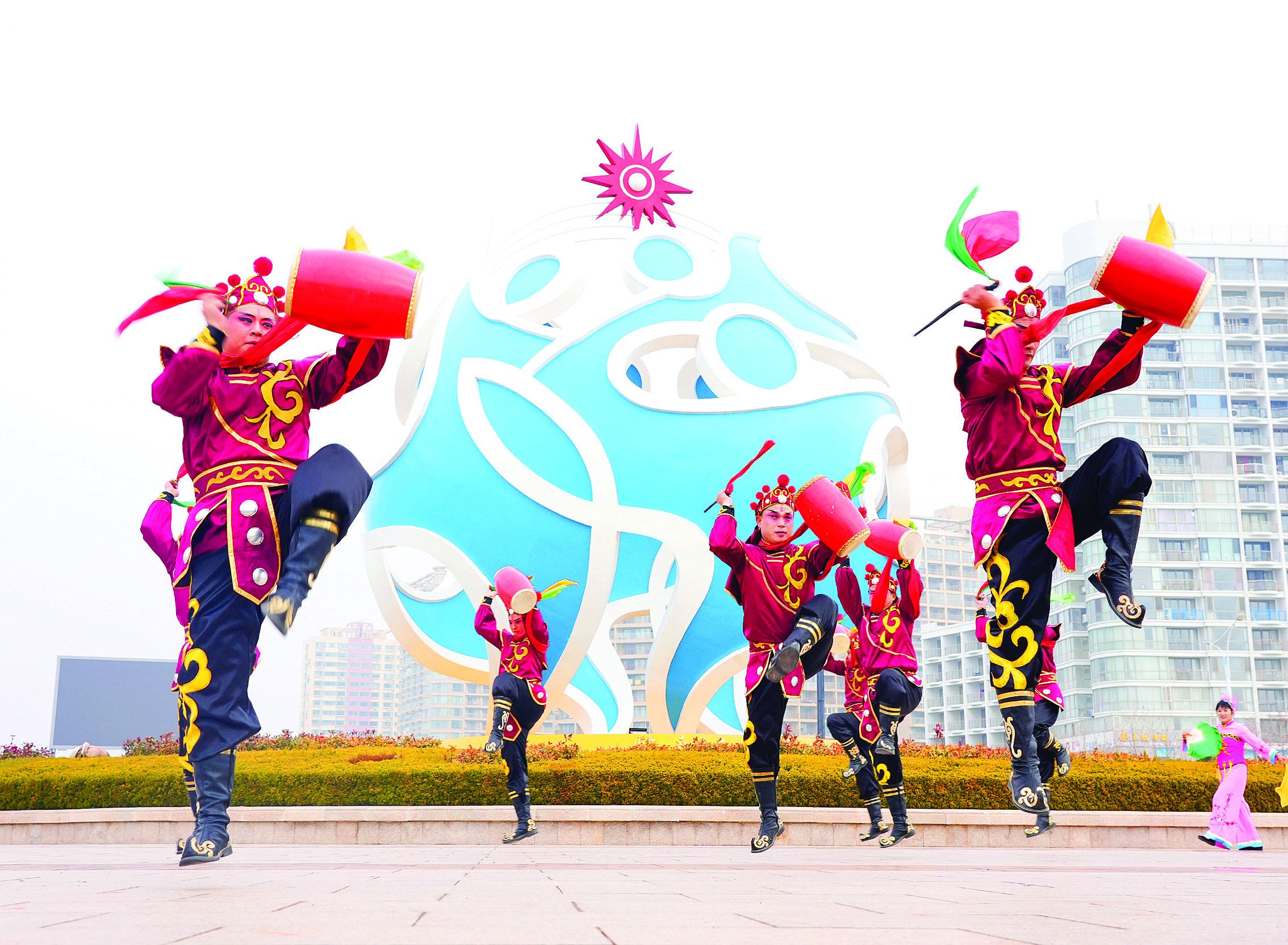 在煙臺(tái)海陽(yáng)市鳳凰廣場(chǎng),海陽(yáng)市京劇團(tuán)的演員們正在排練、展示海陽(yáng)大秧歌。海陽(yáng)大秧歌是一種集歌、舞、戲于一體的民間藝術(shù)形式,屬于山東三大秧歌之一。作為首批入選的國(guó)家級(jí)非物質(zhì)文化遺產(chǎn),先后參加了北京奧運(yùn)會(huì)演出、上海世博會(huì)巡演、西安園藝博覽會(huì)巡演、塞爾維亞貝爾格萊德新春匯演等國(guó)內(nèi)外大型演出。