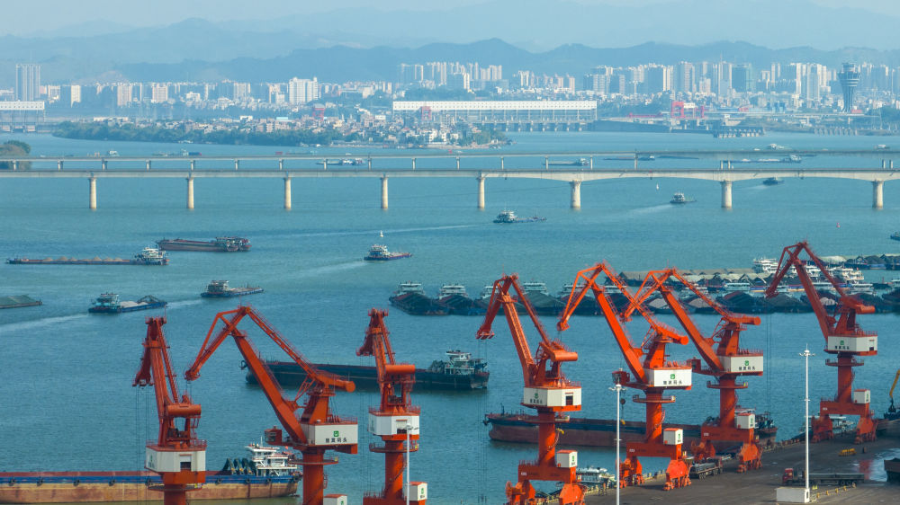1月3日,在廣西梧州臨港經(jīng)濟(jì)區(qū)赤水港碼頭,工人操作設(shè)備在碼頭上進(jìn)行裝卸作業(yè)(無人機(jī)照片)。新華社發(fā)(何華文攝)