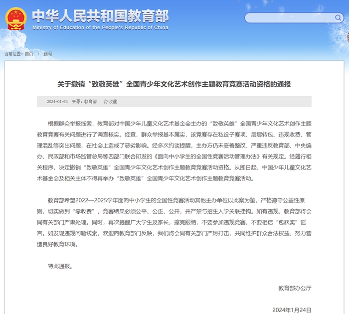 南方網(wǎng)訊 (記者/倪仕軒)1月24日,教育部網(wǎng)站發(fā)布關(guān)于撤銷“致敬英雄”全國青少年文化藝術(shù)創(chuàng)作主題教育競賽活動(dòng)資格的通報(bào),全文如下: