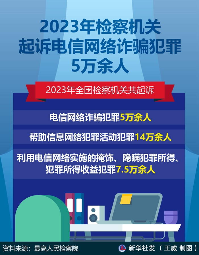 新華社北京3月3日電(記者邢拓)記者3日從最高人民檢察院獲悉,2023年全國檢察機(jī)關(guān)共起訴電信網(wǎng)絡(luò)詐騙犯罪5萬余人、幫助信息網(wǎng)絡(luò)犯罪活動(dòng)犯罪14萬余人、利用電信網(wǎng)絡(luò)實(shí)施的掩飾、隱瞞犯罪所得、犯罪所得收益犯罪7.5萬余人。