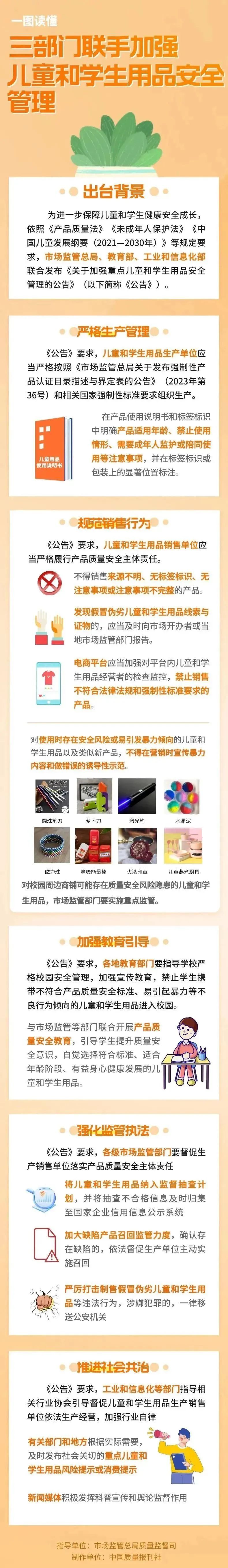 為進一步保障兒童和學生健康安全成長,依照《產(chǎn)品質(zhì)量法》《未成年人保護法》《中國兒童發(fā)展綱要(2021—2030年)》等規(guī)定要求,現(xiàn)就加強重點兒童和學生用品安全管理有關事項公告如下: