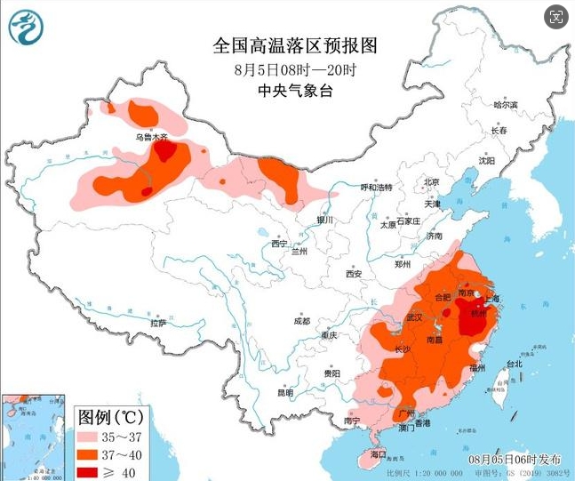 預(yù)計8月5日白天,內(nèi)蒙古西部、新疆準(zhǔn)噶爾盆地和南疆盆地、甘肅河西、河南南部、安徽、山東南部、江蘇、上海、湖北大部、湖南、江西、浙江、福建大部、廣西中東部、廣東、海南島大部等地有35℃以上高溫天氣,其中,內(nèi)蒙古西部、新疆準(zhǔn)噶爾盆地和南疆盆地、安徽大部、江蘇大部、上海大部、湖北東部、湖南大部、江西、浙江、福建大部、廣東中部和北部、廣西東北部等地部分地區(qū)最高氣溫37℃以上,新疆吐魯番盆地、安徽南部、浙江中西部等地局地可達(dá)40℃以上。