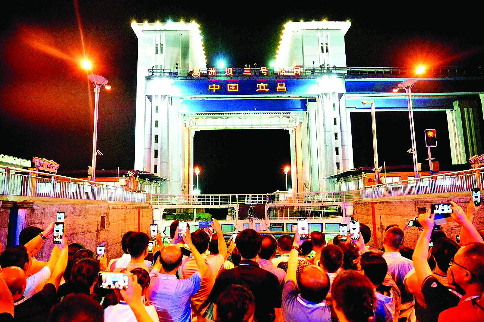 夜幕低垂,各地媒體代表登上“長江三峽10”游輪,順江而下穿宜萬鐵路大橋后,折返逆江而上。甲板上,民俗歌舞表演引人入勝。北岸燈火輝煌,南山光影綽約,天然塔、萬達廣場、磨基山、鎮(zhèn)江閣等漸次出鏡,詩意古韻和時尚建筑浸入一江柔波。在過葛洲壩船閘時,各地媒體代表紛紛掏出手機打卡拍照,體驗“水漲船高”的新奇感。