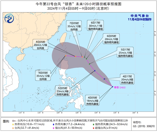 據(jù)中國(guó)天氣網(wǎng)消息,今年第22號(hào)臺(tái)風(fēng)“銀杏”(熱帶風(fēng)暴級(jí),英文名稱:Yinxing;名字來源:中國(guó);名字意義:一種原產(chǎn)于中國(guó)的樹)已于今天(11月4日)早晨在西北太平洋洋面上生成,早晨5點(diǎn)鐘其中心位于菲律賓馬尼拉東偏南方向約1450公里的洋面上,就是北緯11.7度、東經(jīng)134.0度,中心附近最大風(fēng)力有8級(jí)(18米/秒),中心最低氣壓1000百帕,七級(jí)風(fēng)圈半徑180公里。