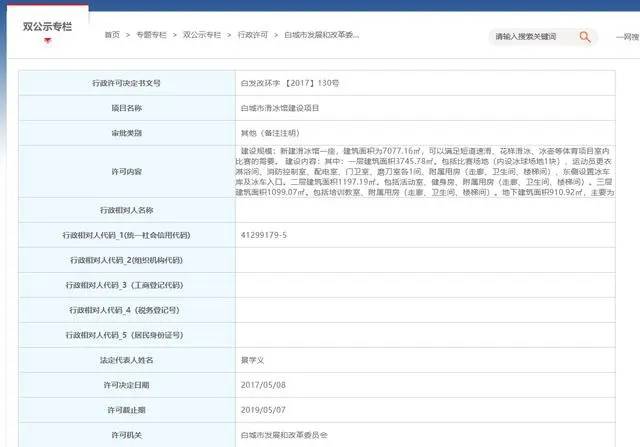 記者注意到,在當?shù)卣俜骄W站上,有關于該項目建設行政許可相關材料:白發(fā)改環(huán)字【2017】130號顯示:白城市滑冰館建設項目的許可單位為白城市發(fā)展和改革委員會,許可決定日期為2017年05月08日,建設規(guī)模為:新建滑冰館一座,建筑面積為7077.16㎡,可以滿足短道速滑、花樣滑冰、冰壺等體育項目室內比賽的需要。