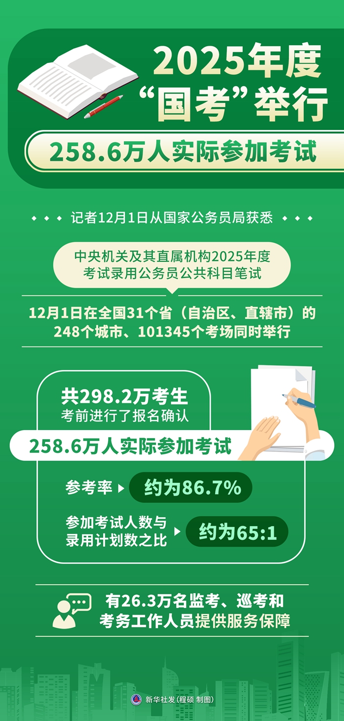 新華社北京12月1日電 記者1日從國家公務(wù)員局獲悉,中央機關(guān)及其直屬機構(gòu)2025年度考試錄用公務(wù)員公共科目筆試1日在全國31個。ㄗ灾螀^(qū)、直轄市)的248個城市、101345個考場同時舉行,共298.2萬考生考前進行了報名確認、258.6萬人實際參加考試,參考率約為86.7%,參加考試人數(shù)與錄用計劃數(shù)之比約為65:1,有26.3萬名監(jiān)考、巡考和考務(wù)工作人員提供服務(wù)保障。