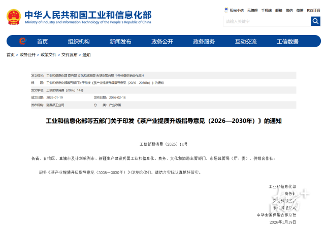 2月14日,工業(yè)和信息化部等五部門印發(fā)的《茶產(chǎn)業(yè)提質(zhì)升級指導(dǎo)意見(2026—2030年)》對外發(fā)布。