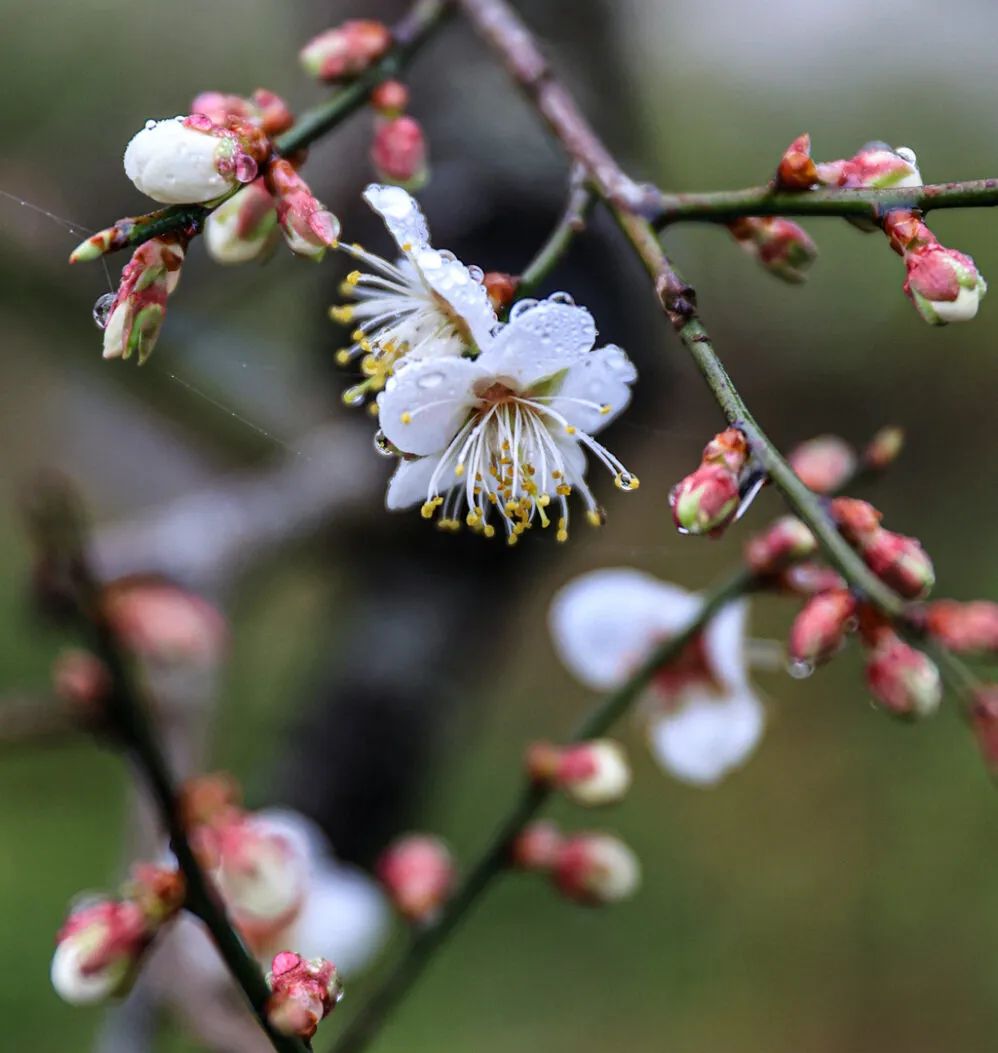 潔白的花瓣上沾著滴滴晶瑩剔透的雨滴,