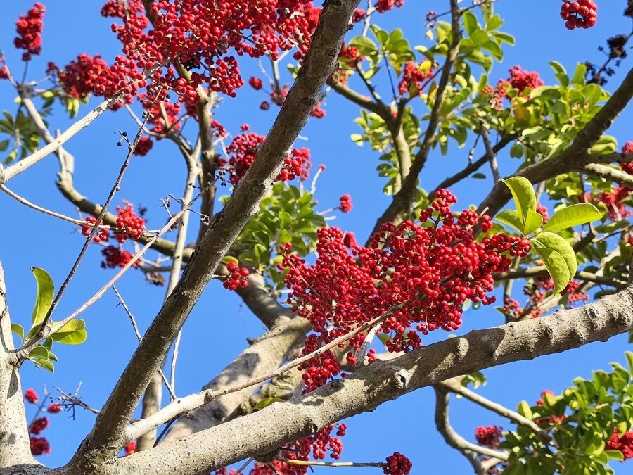 晴朗的春日里,記者在市區(qū)江北沿江路一帶發(fā)現(xiàn)一條很有特色的“果路”,這里的行道樹結(jié)出火紅色果實(shí),紅彤彤的果實(shí)簇?fù)碓谝黄,成串成串地掛滿枝頭,在蔚藍(lán)的天際下向陽生長(zhǎng),遠(yuǎn)遠(yuǎn)望去,成片紅紅火火的景象,眼前的美景著實(shí)令人感到驚艷。