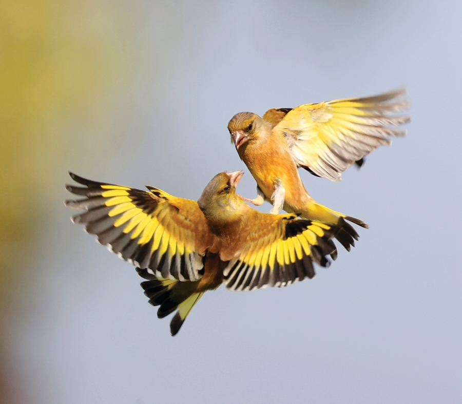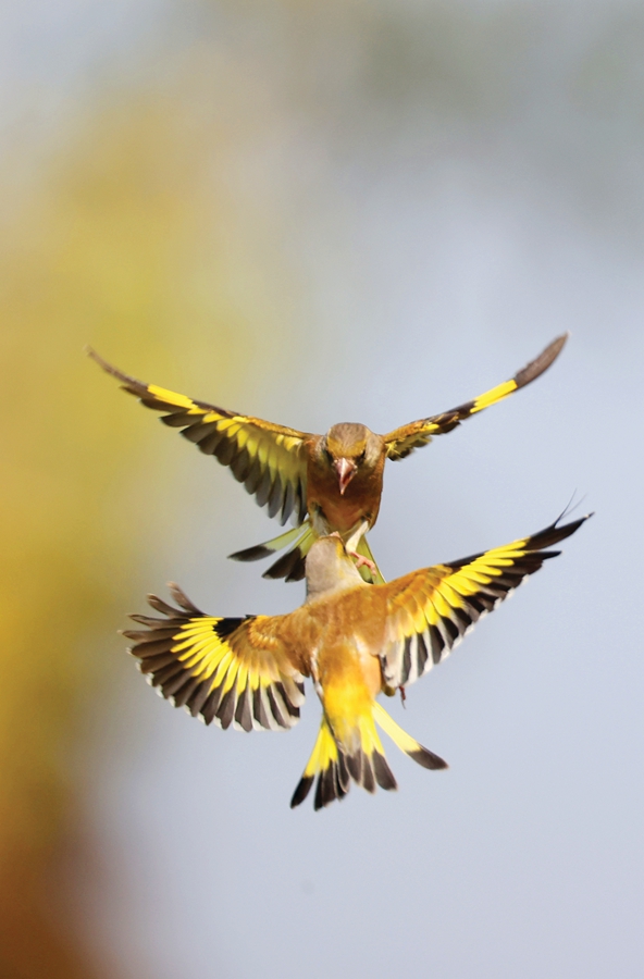 站在葵花上的金翅雀熟練準(zhǔn)確地啄下葵花籽,用特有的喙輕松剝?nèi)ネ鈿,吃下雪白的瓜子仁,整個動作一氣呵成,非?蓯邸=鸪崛革w舞時,展開的黃色翅膀非常耀眼,與葵花的黃色交相輝映,繪就一幅幅完美的畫作,更讓葵園充滿了勃勃生機(jī)。