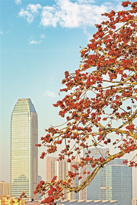 “最近聽說這邊的木棉開了,恰好出來活動活動。”住在附近的李奶奶說,趁著上午天氣好,就拉著老伴出來散步賞花,順便撿一些木棉花回去曬干煲湯。望著枝頭上的木棉花,在藍(lán)天白云的托襯下,似乎更加火紅,更加鮮艷。紅艷艷的木棉花為城市增添了濃濃的生機(jī)。