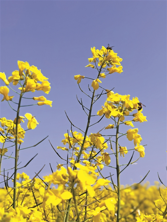 一片片金黃色的油菜花開滿了田間地頭,黃色的花朵點(diǎn)綴在綠葉間,微風(fēng)拂過,搖曳生姿。金燦燦的油菜花還引來了無數(shù)小蜜蜂在花叢中“嗡嗡嗡”伴奏,好一派迷人的景象,令人賞心悅目,心曠神怡。趁著周末,不少的游客紛紛走出家門,在花叢中用鏡頭定格美好春光。