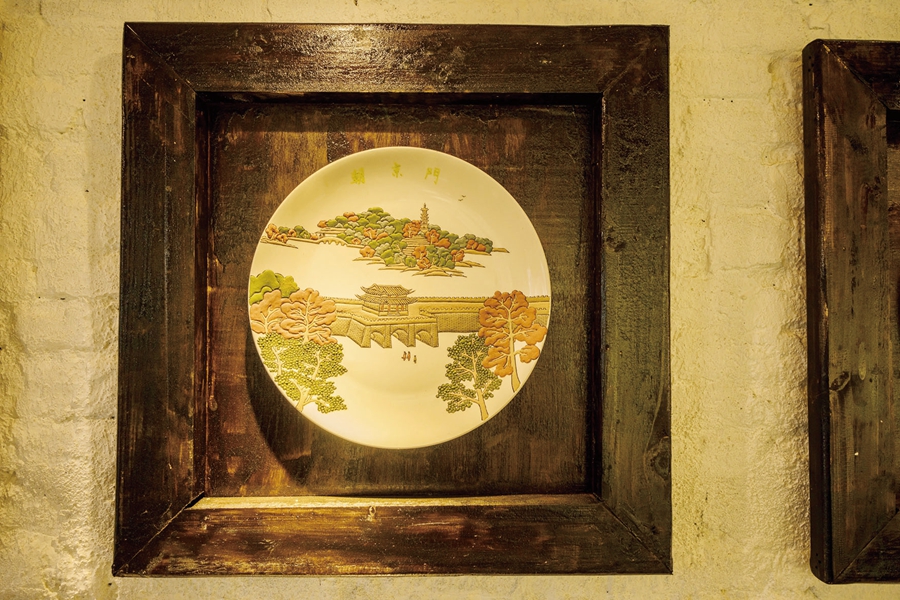 店面招牌用惠州彩瓷盤(pán)子堆彩“水”“長(zhǎng)”“東”三字。