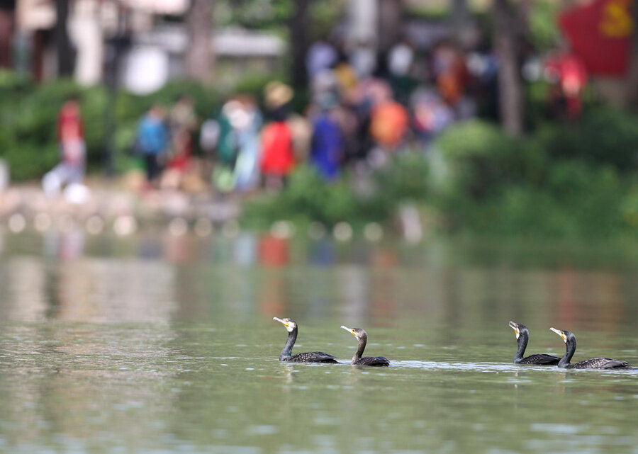 “幾處早鶯爭暖樹,誰家新燕啄春泥!卑拙右住跺X塘湖春行》中這句耳熟能詳?shù)脑娋,描繪了春天鳥語花香、生機(jī)勃勃的景象。近日,惠州重現(xiàn)了詩句中的美景——在市區(qū)江北東江公園客家女雕像附近,每天早晨總能看見一群鸕鶿,它們時(shí)而在水中嬉戲覓食,時(shí)而翩翩起舞,一幅人與自然和諧共融的生動畫卷盡收眼底,令人贊嘆不已。