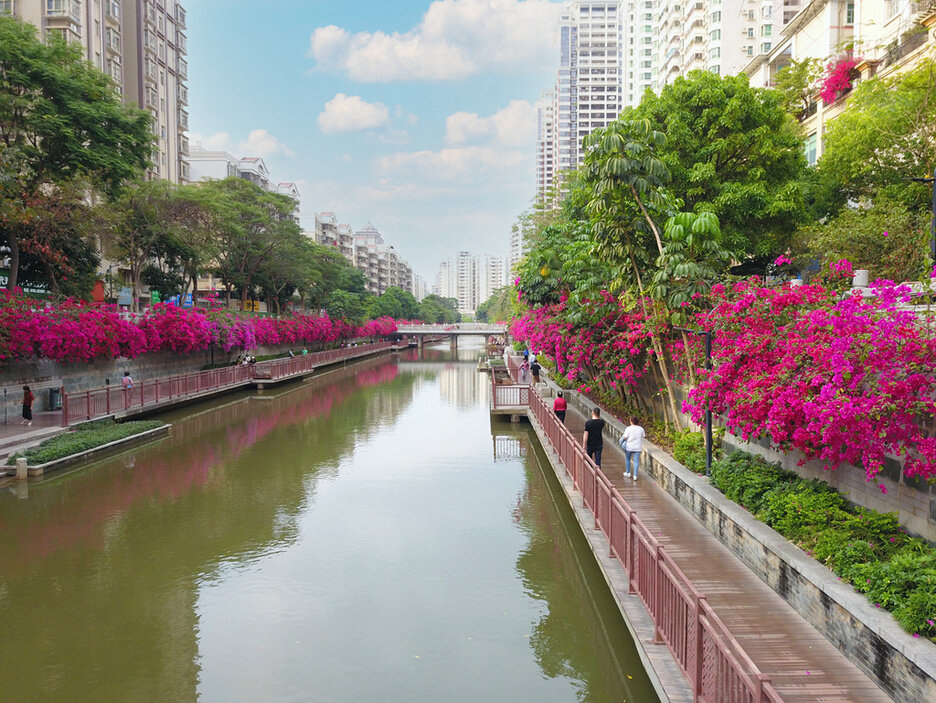 3月24日,記者來到金山河公園,只見河兩邊的三角梅競相開放,春意盎然。親水棧道上,早起的市民在散步、跑步,也有市民同框美麗的三角梅拍照留念,或家人朋友相約游春賞景……人們陶醉在如畫的風光之中,享受著美好的春日時光。