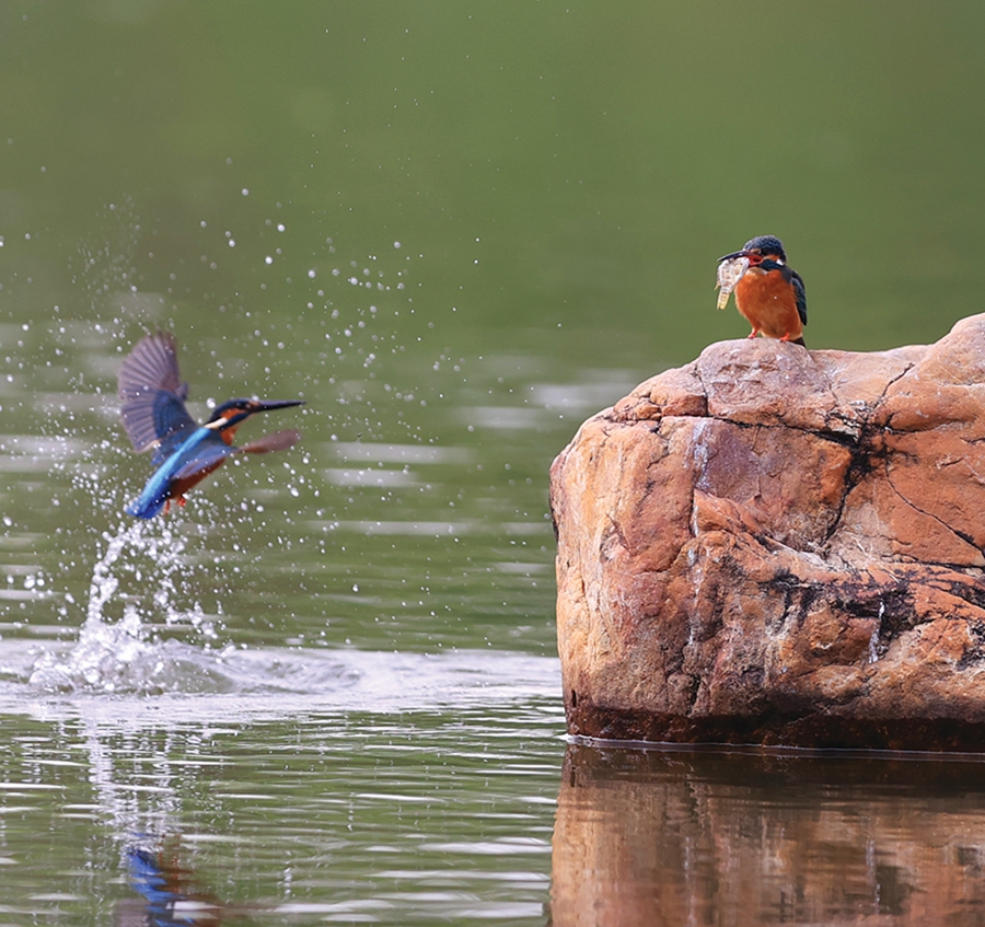 近期,每日清晨6點(diǎn)20分左右,翠鳥夫人便飛到惠州植物園湖中的一塊石頭上,先是扎進(jìn)水中,再飛回石頭上,精心梳洗打扮一番,便在上面鳴叫幾聲,等著翠鳥丈夫的到來。翠鳥丈夫則把準(zhǔn)備好的早餐叼到翠鳥夫人面前:有時(shí)是小魚,會(huì)把小魚的頭對(duì)著翠鳥夫人的嘴巴送過去,這樣吞咽的時(shí)候魚鰭就不會(huì)扎到喉嚨;有時(shí)是小蝦,他會(huì)把蝦尾對(duì)準(zhǔn)翠鳥夫人的嘴巴,這樣吞咽時(shí)就不會(huì)被蝦槍刺到喉嚨。午餐、晚餐,翠鳥丈夫都不辭辛勞地忙碌著,湖中充足的魚蝦滿足了翠鳥夫婦的饕餮之欲。丈夫無微不至的溫情和聰明贏得了翠鳥夫人的芳心,他們每天有2~3次的交配,蜜月期要持續(xù)一個(gè)星期左右。之后,便開始孵化幼鳥。
