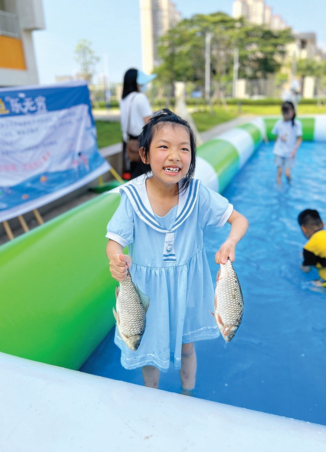 惠城區(qū)金山湖小學(xué)的孩子們?cè)谛@里開(kāi)心抓魚(yú)。