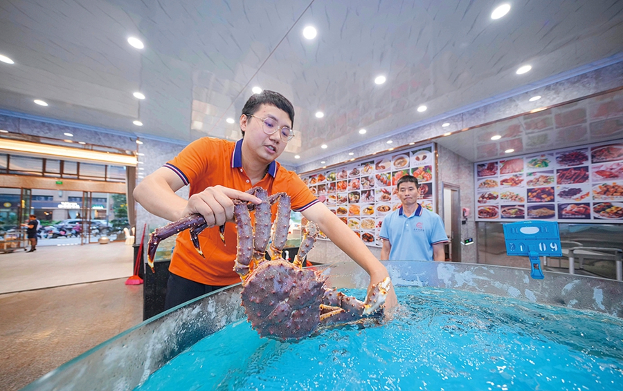 昌樺海鮮樓二代經(jīng)營(yíng)者黃楚斌展示帝王蟹。