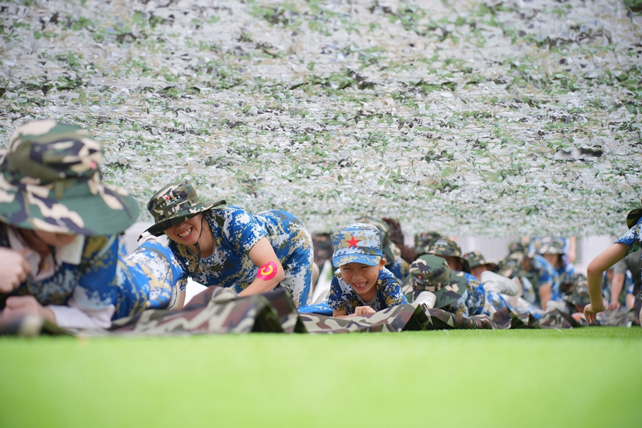 草地上架空著一張迷彩網(wǎng),教官一聲令下,家長(zhǎng)們帶著孩子匍匐前進(jìn),一個(gè)接一個(gè)打探敵情,開(kāi)展競(jìng)速比拼,個(gè)個(gè)有模有樣。