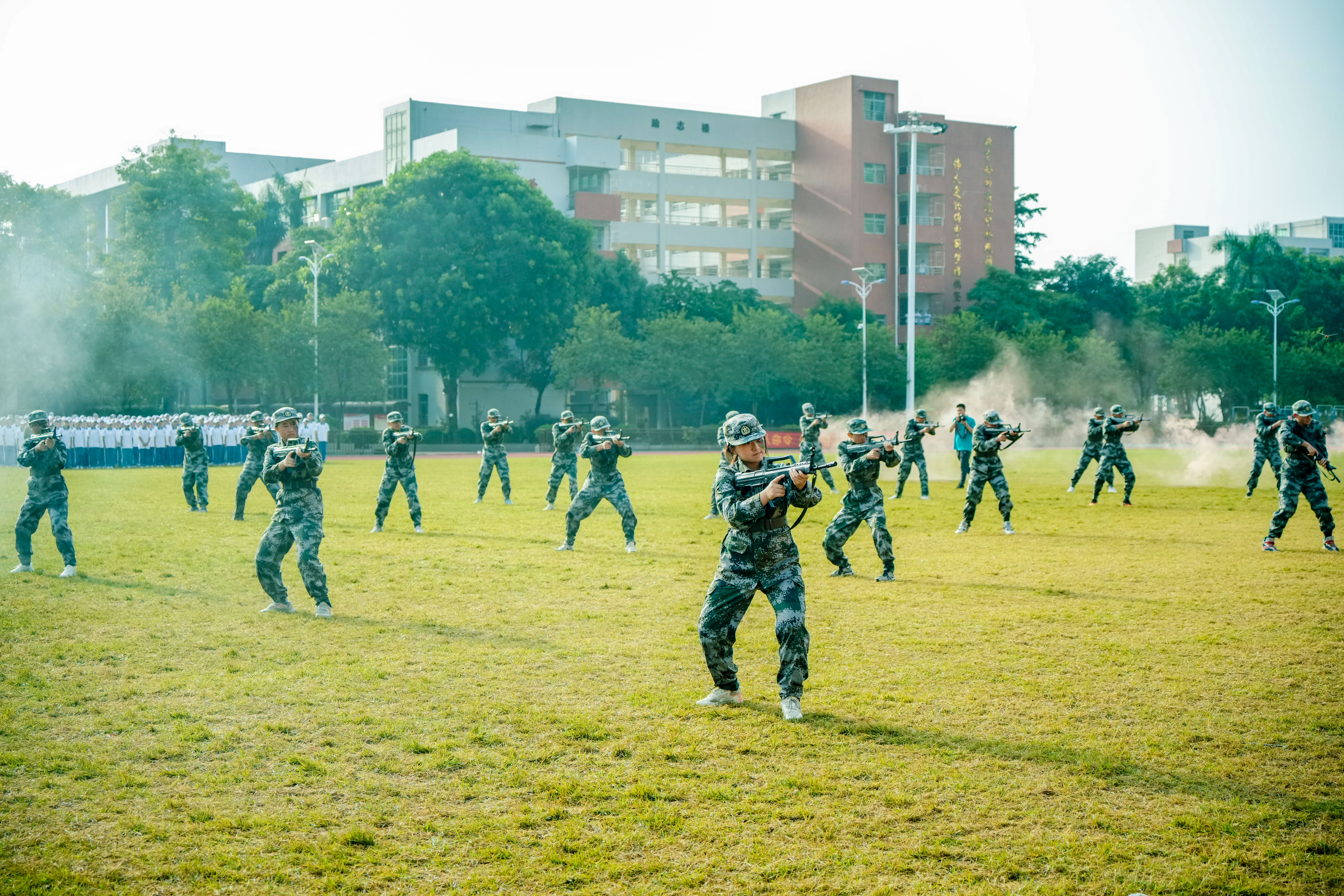 軍事科目展演精彩紛呈,從干凈利落的擒敵拳、軍體拳,到行云流水的匕首操、刺殺操,再到場面火爆的戰(zhàn)術基礎動作。一令一動蘊含鋼鐵意志,一招一式盡展少年英姿。