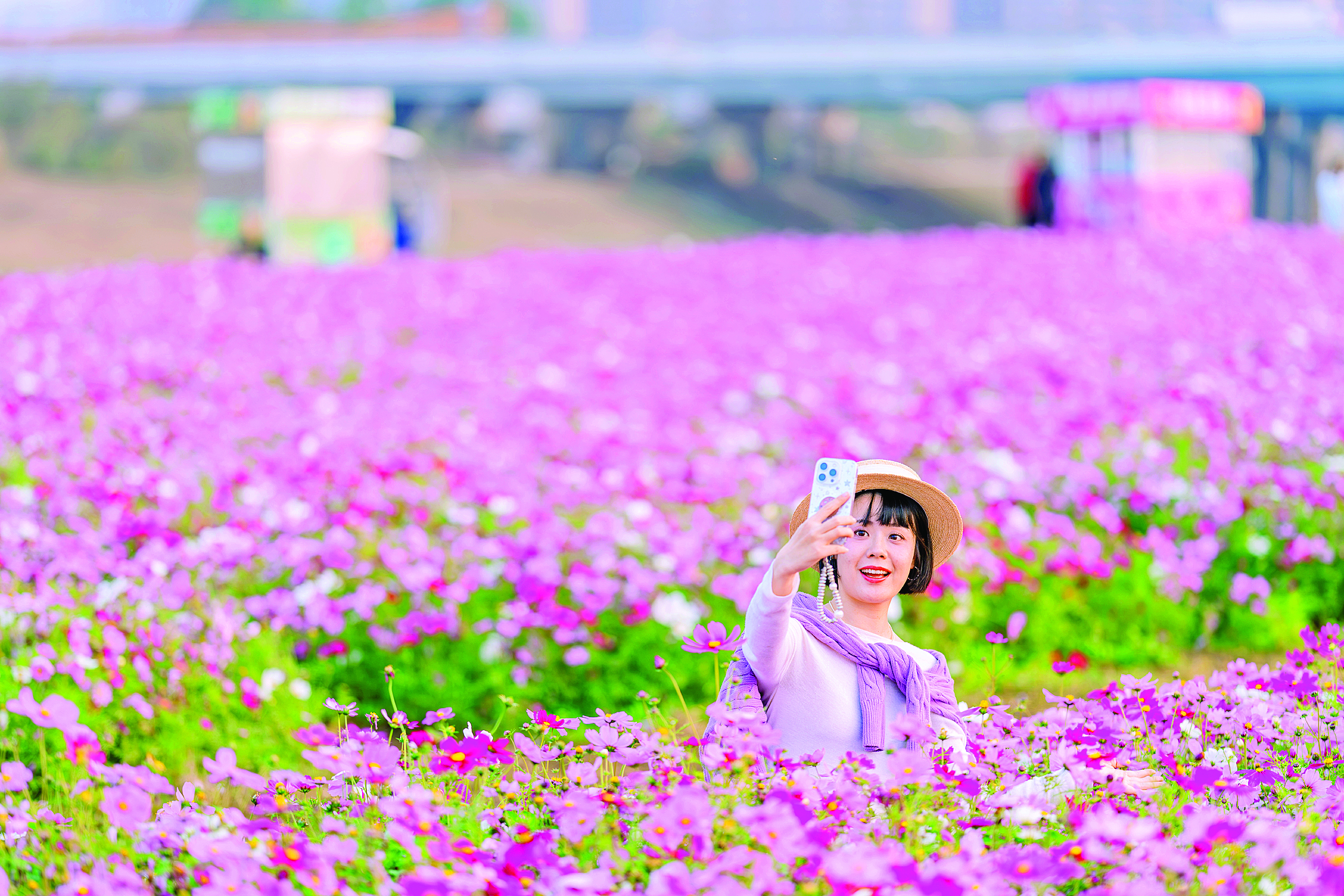 春風拂過惠州惠城區(qū)小金河大道,各色格;ǜ傁嚅_放,接連成片的粉、白、紫、紅相間的花海,引得市民游客前往觀賞。格;ɑò旮叩湾e落,色彩繽紛,構成一幅春意盎然的畫卷。圖為游客在格;êV信恼;葜萑請笥浾咧荛 攝