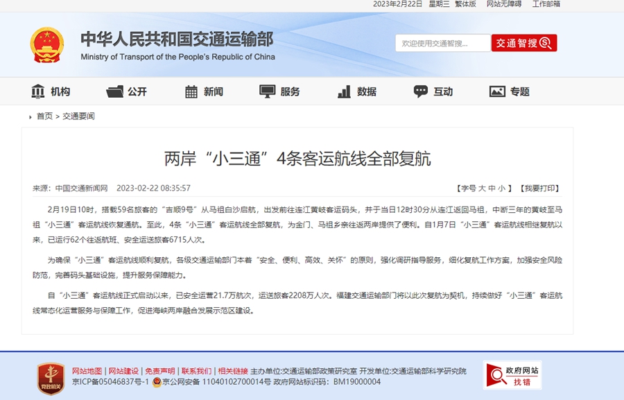 南方網(wǎng)訊 據(jù)交通運(yùn)輸部網(wǎng)站消息,2月19日10時(shí),搭載59名旅客的“吉順9號(hào)”從馬祖白沙啟航,出發(fā)前往連江黃岐客運(yùn)碼頭,并于當(dāng)日12時(shí)30分從連江返回馬祖,中斷三年的黃岐至馬祖“小三通”客運(yùn)航線恢復(fù)通航。至此,4條“小三通”客運(yùn)航線全部復(fù)航,為金門、馬祖鄉(xiāng)親往返兩岸提供了便利。自1月7日“小三通”客運(yùn)航線相繼復(fù)航以來(lái),已運(yùn)行62個(gè)往返航班、安全運(yùn)送旅客6715人次。