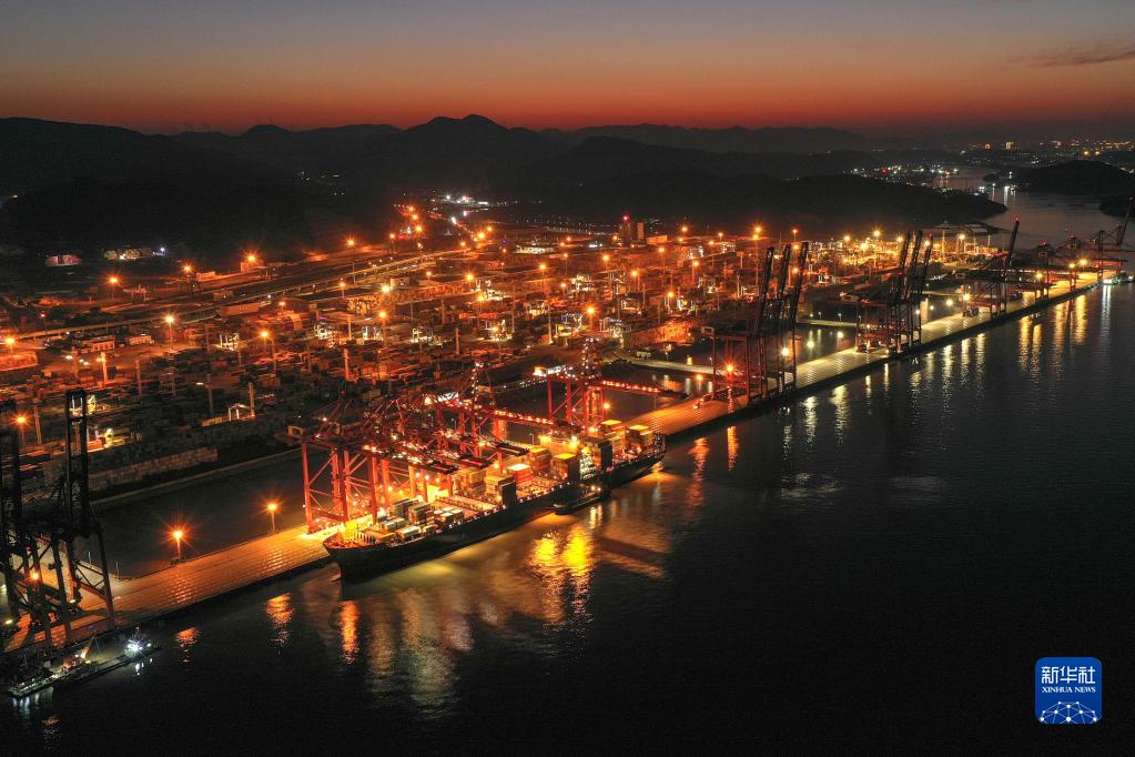 夜幕下,一艘貨輪停靠在寧波舟山港穿山港區(qū)集裝箱碼頭(1月31日攝,無人機(jī)照片)。新華社記者 黃宗治 攝