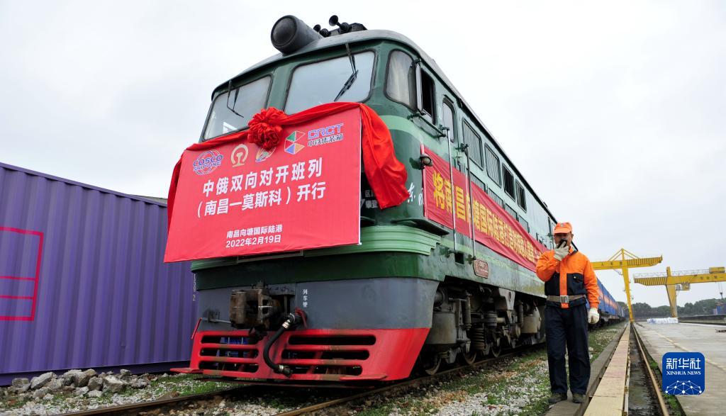 2022年江西首列中俄雙向?qū)﹂_班列(南昌—莫斯科)在南昌向塘國(guó)際陸港準(zhǔn)備出發(fā)(2022年2月19日攝)。新華社記者 彭昭之 攝