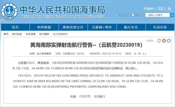 據(jù)中國海事局網(wǎng)站消息,連云港海事局發(fā)布航行警告,3月20日9時至16時和3月21日9時至11時,黃海南部部分海域進行實彈射擊,禁止駛?cè)搿?/p>