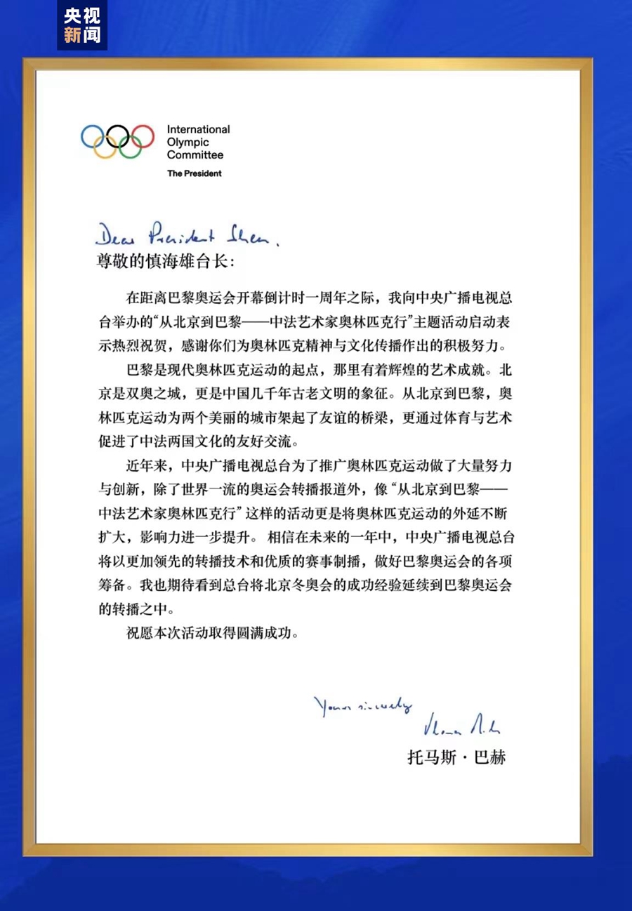 國際奧委會(huì)主席巴赫在賀信中表示,中央廣播電視總臺(tái)為了推廣奧林匹克運(yùn)動(dòng)做了大量努力與創(chuàng)新,除了世界一流的奧運(yùn)會(huì)轉(zhuǎn)播報(bào)道外,像“從北京到巴黎——中法藝術(shù)家奧林匹克行”這樣的活動(dòng)更是將奧林匹克運(yùn)動(dòng)的外延不斷擴(kuò)大,影響力進(jìn)一步提升。相信在未來的一年中,中央廣播電視總臺(tái)將以更加領(lǐng)先的轉(zhuǎn)播技術(shù)和優(yōu)質(zhì)的賽事制播,做好巴黎奧運(yùn)會(huì)的各項(xiàng)籌備,期待看到總臺(tái)將北京冬奧會(huì)的成功經(jīng)驗(yàn)延續(xù)到巴黎奧運(yùn)會(huì)的轉(zhuǎn)播之中。