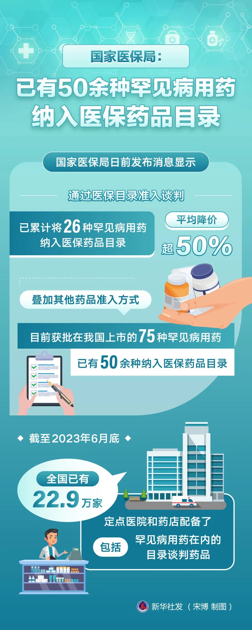 在罕見病用藥供應保障方面,國家醫(yī)保局聯(lián)合國家衛(wèi)生健康委先后印發(fā)相關文件,通過定點醫(yī)療機構和定點零售藥店兩個渠道,滿足談判藥品供應保障、臨床適應等方面的合理需求。截至2023年6月底,全國已有22.9萬家定點醫(yī)院和藥店配備了包括罕見病用藥在內(nèi)的目錄談判藥品。