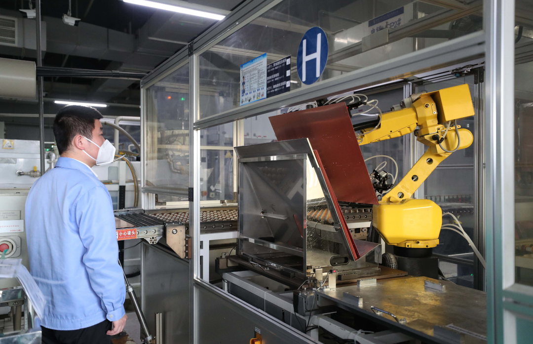 億緯鋰能軟包三元電池生產(chǎn)車間,機器人代替人工高速運轉(zhuǎn)。惠州日報記者李松權(quán) 攝