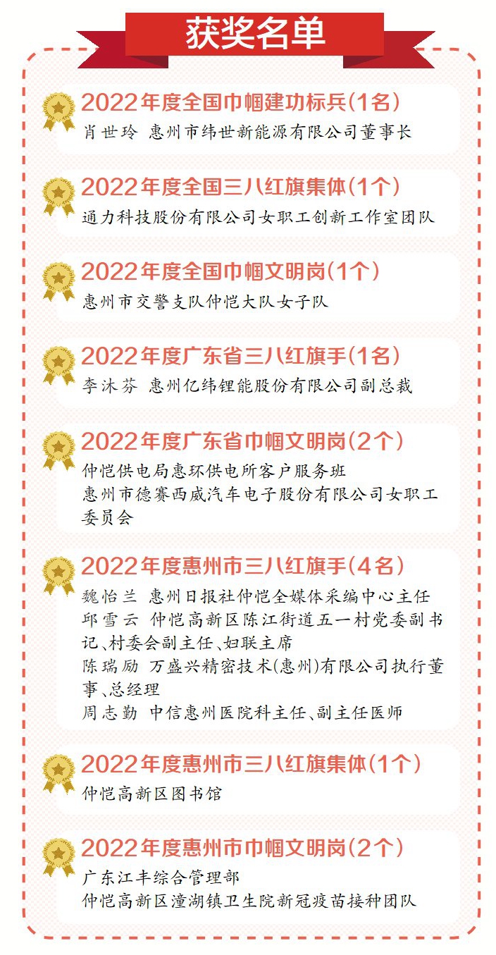 仲愷高新區(qū)婦聯(lián)主席吳歡歡介紹,在2022年度,該區(qū)巾幗奮發(fā)向上、銳意進取,在各條戰(zhàn)線綻放芳華,除通力科技股份有限公司女職工創(chuàng)新工作室團隊榮獲全國三八紅旗集體稱號外,惠州市交警支隊仲愷大隊女子隊榮獲全國巾幗文明崗稱號,惠州市緯世新能源有限公司董事長肖世玲榮獲全國巾幗建功標兵稱號;1人榮獲省三八紅旗手稱號,2個單位榮獲省巾幗文明崗稱號;4人榮獲市三八紅旗手稱號,1個單位榮獲市三八紅旗集體稱號,2個單位榮獲市巾幗文明崗稱號;25人榮獲區(qū)三八紅旗手稱號,7個單位榮獲區(qū)三八紅旗集體稱號,10個單位榮獲區(qū)巾幗文明崗稱號。