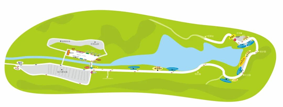 彩跑路線:紅花湖景區(qū)內游客中心標識處設起跑點和終點,主壩處設折返點,全長約6公里;