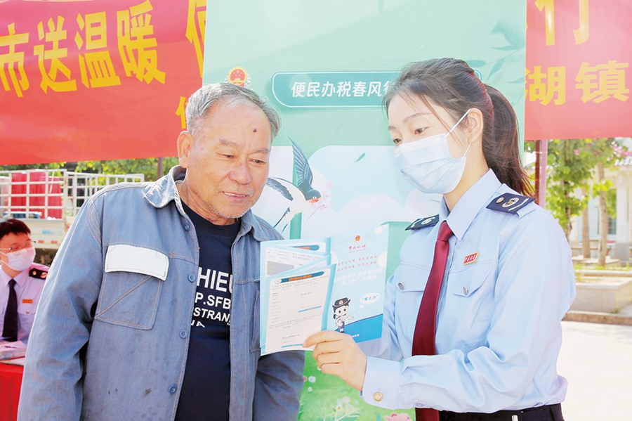 稅務(wù)人員向市民派發(fā)辦稅繳費(fèi)操作手冊(cè)。