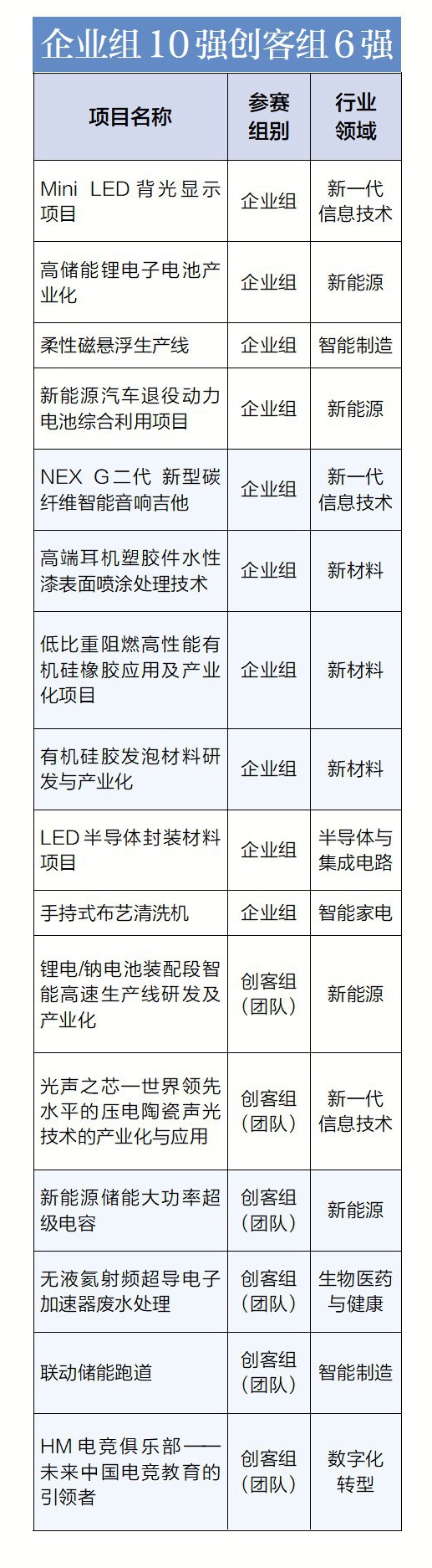 據(jù)介紹,本屆大賽自5月啟動以來,吸引了154家企業(yè)/團隊報名參賽,涉及行業(yè)領(lǐng)域豐富,主要來自省級專精特新企業(yè)、各縣(市、區(qū))重點園區(qū)和國家、省、市中小微創(chuàng)業(yè)創(chuàng)新基地以及各大高校。經(jīng)過項目征集和初賽評選,賽事組委會從154個優(yōu)質(zhì)創(chuàng)新項目中,遴選產(chǎn)生20個企業(yè)組和12個創(chuàng)客組共32個項目晉級本場決賽,在此競爭惠州地市賽16強席位。