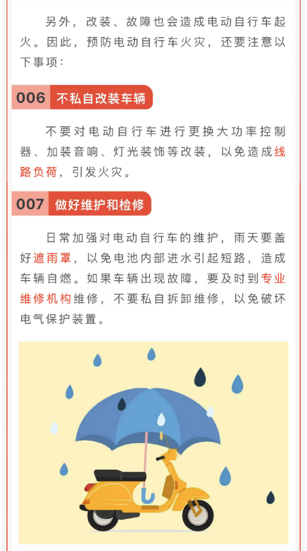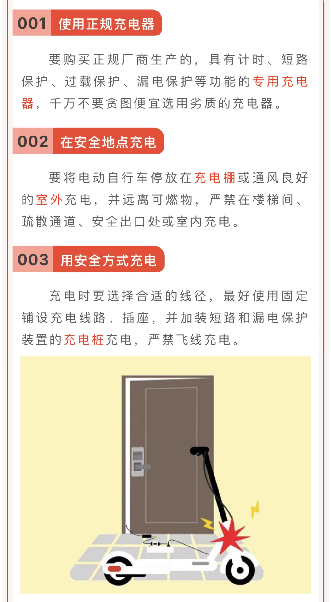 避免電動(dòng)車火災(zāi),要做到:購(gòu)買(mǎi)正規(guī)廠家生產(chǎn)的合格產(chǎn)品,電池定期保養(yǎng),不擅自改裝等等,更多注意事項(xiàng),請(qǐng)務(wù)必查看下圖。
