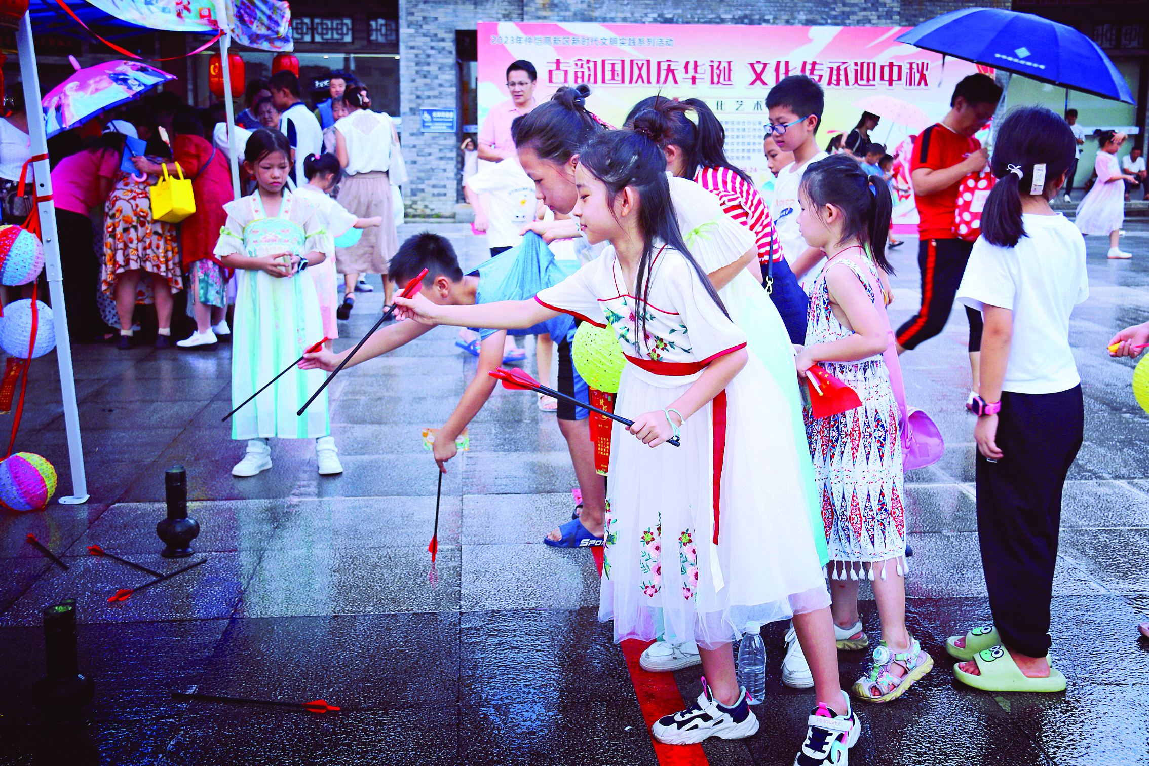 現(xiàn)場最為火爆的還是國潮文化市集。國潮文化市集展區(qū)設(shè)置了潮玩猜燈謎、投壺大作戰(zhàn)、飛花傳詩韻等5大傳統(tǒng)游戲互動攤位,參與者們通過兌換券及集章可在禮品兌換區(qū)兌換對應(yīng)禮品。好玩的游戲、好看的禮品吸引眾多群眾前來“趕集”,各個活動攤位排起了長長的隊伍,大人帶著小朋友一家子齊上陣,玩得不亦樂乎。