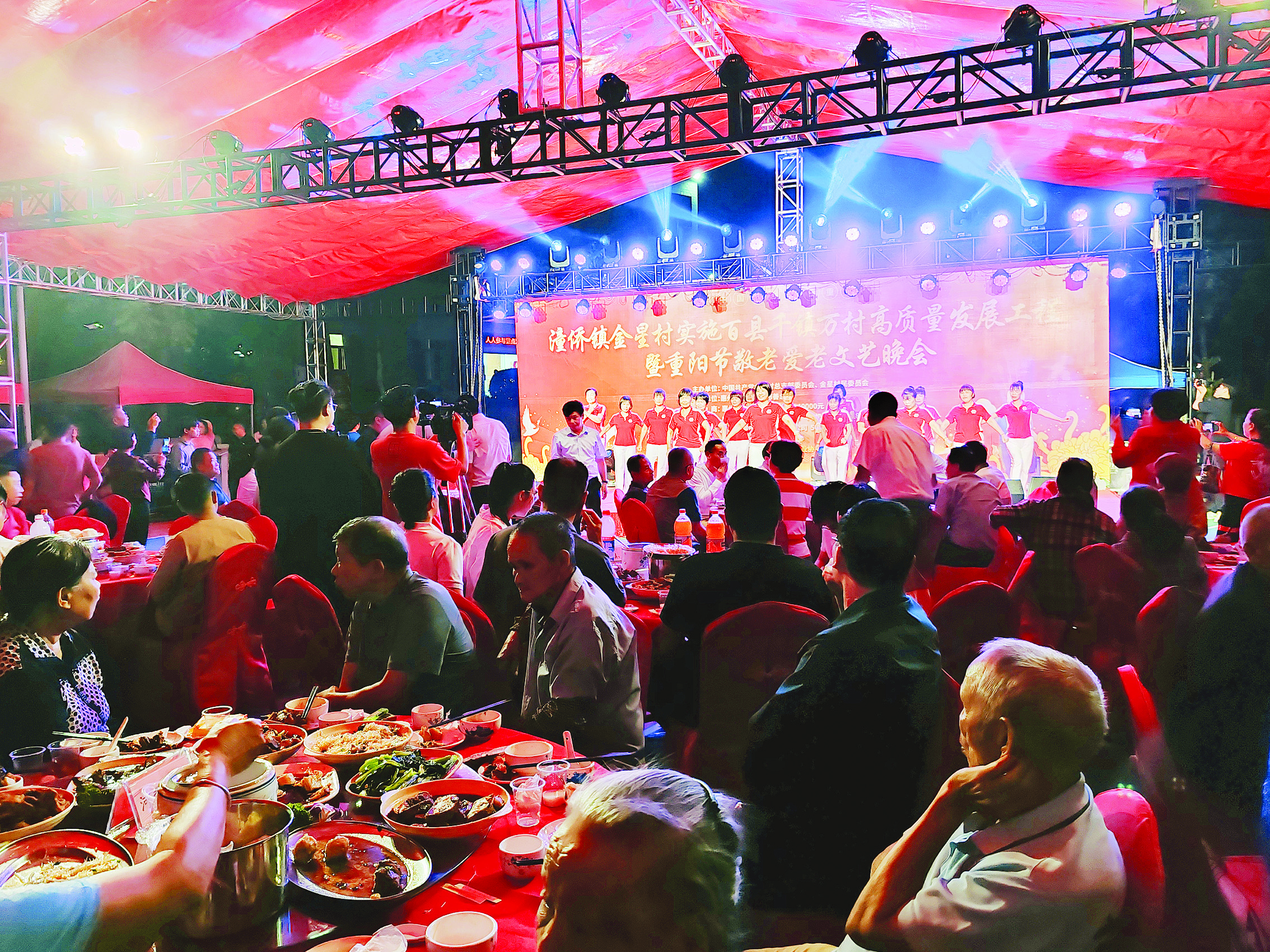 10月20日,夜幕漸漸降臨,仲愷高新區(qū)潼僑鎮(zhèn)金星村委會門前籃球場的燈光亮起來了,宴席擺開了,老人們三三兩兩結伴而來,參加2023年潼僑鎮(zhèn)金星村實施百縣千鎮(zhèn)萬村高質量發(fā)展工程暨重陽節(jié)敬老愛老文藝晚會,陣陣歡聲笑語回蕩在這個美麗的村落中。