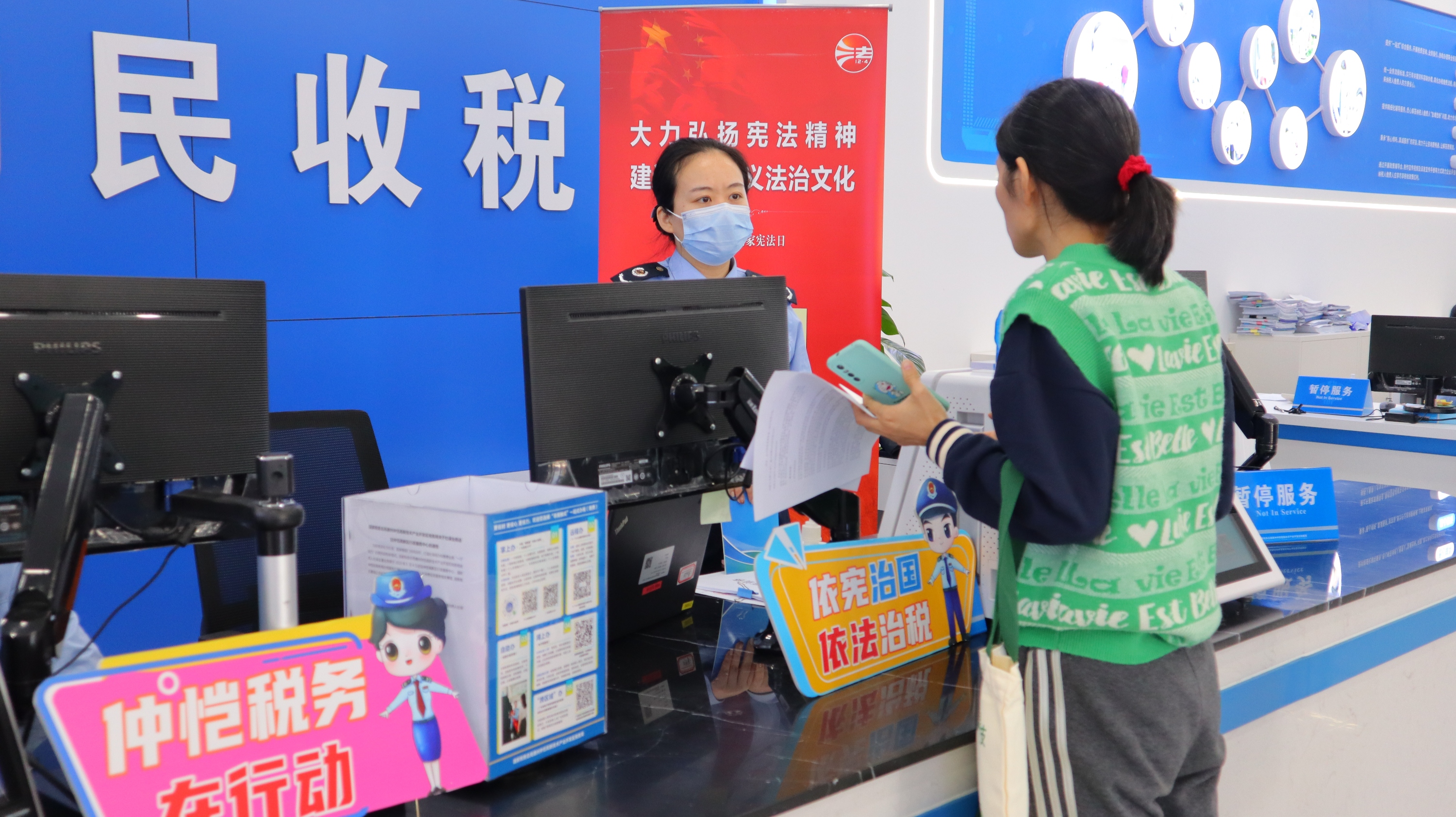 辦稅服務(wù)廳工作人員向納稅人繳費(fèi)人普及憲法。 仲愷區(qū)稅務(wù)局供圖