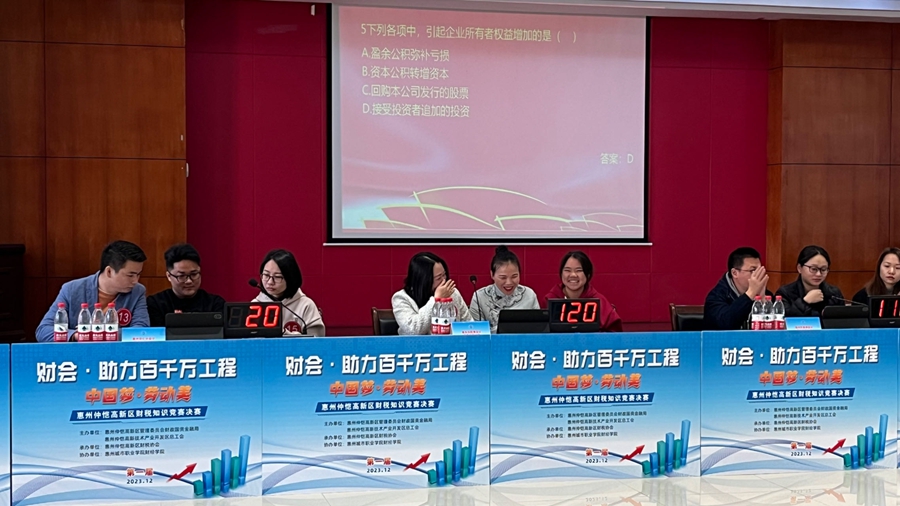 惠州日?qǐng)?bào)訊 (記者林麗娟 通訊員李世維)2023年12月28日,仲愷高新區(qū)首屆財(cái)稅知識(shí)競(jìng)賽決賽上演激烈角逐,12支隊(duì)伍36名隊(duì)員你爭(zhēng)我搶,展現(xiàn)深厚的知識(shí)功底。經(jīng)過激烈的比拼,最后,惠州市泰博會(huì)計(jì)服務(wù)有限公司勇奪桂冠,惠州市仁豐會(huì)計(jì)服務(wù)有限公司、中外運(yùn)物流(惠州)有限公司榮獲第二名,惠州市新惠會(huì)計(jì)服務(wù)有限公司、惠州億緯集能有限公司、惠州同協(xié)財(cái)稅服務(wù)有限公司獲得第三名。
