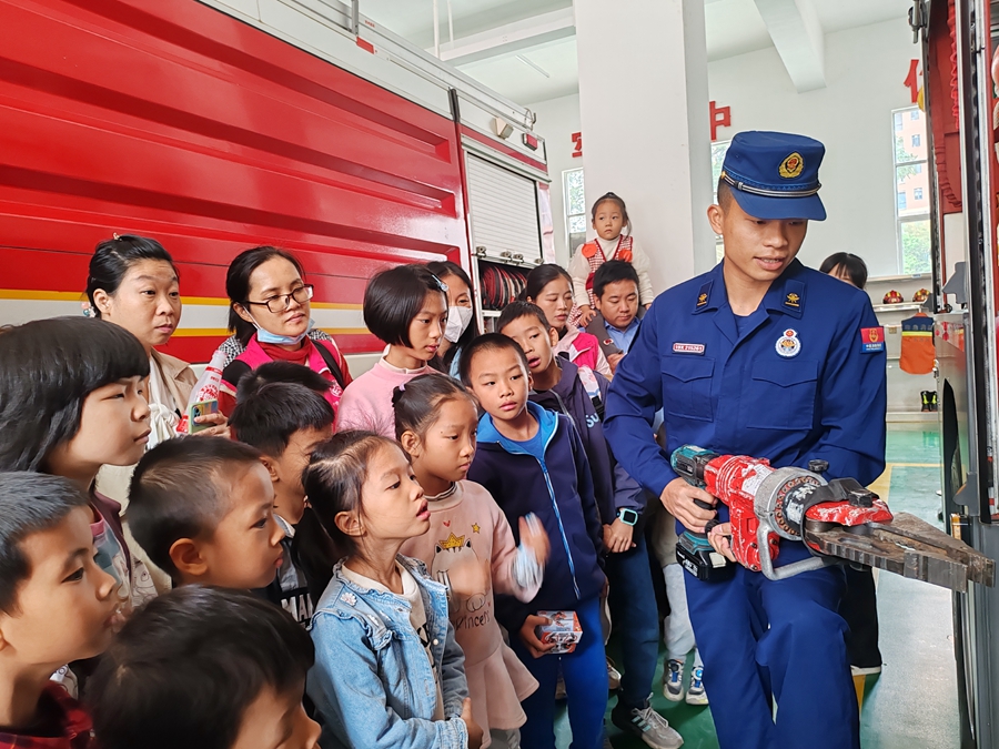 孩子們參觀消防器材。