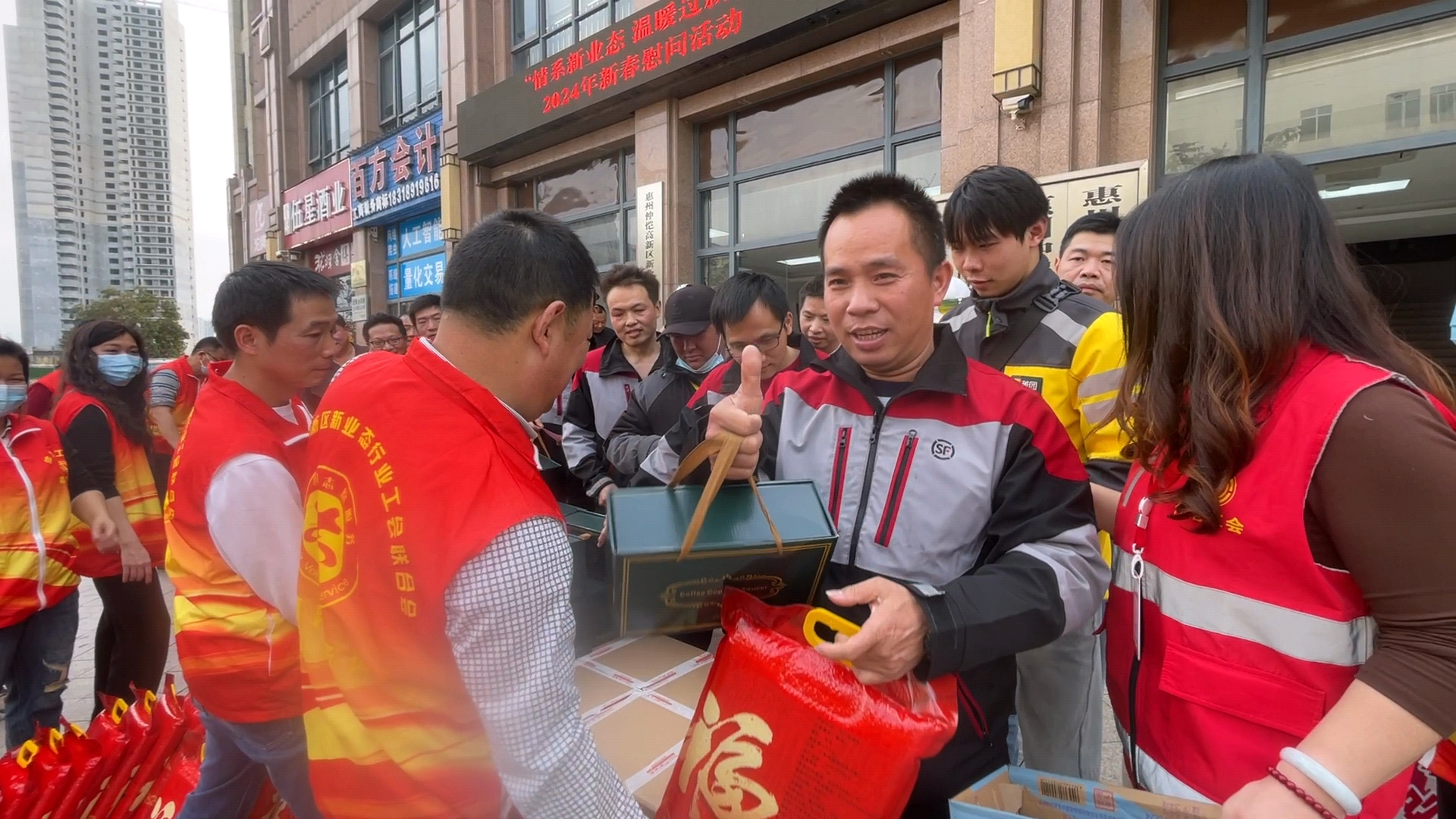 新業(yè)態(tài)勞動者高興地領(lǐng)取新春福利。 惠州日報(bào)記者邱舒婷 攝