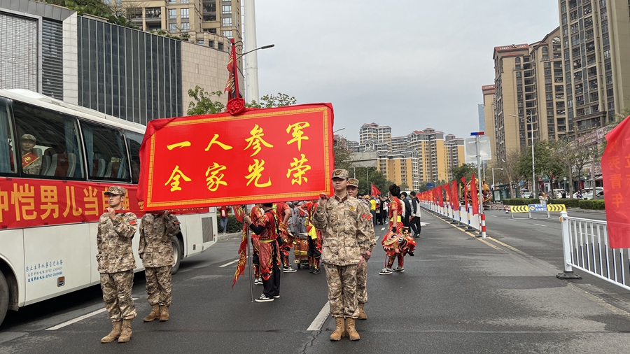儀式結(jié)束后,歡送游行開(kāi)始。25名新兵身穿戎裝,肩披綬帶,胸戴紅花,昂首走在前列,老兵代表、學(xué)生代表、家屬代表、相關(guān)單位代表組成不同方陣,緊隨相送。沿途不少群眾駐足觀看,還有的人自發(fā)加入歡送隊(duì)伍。