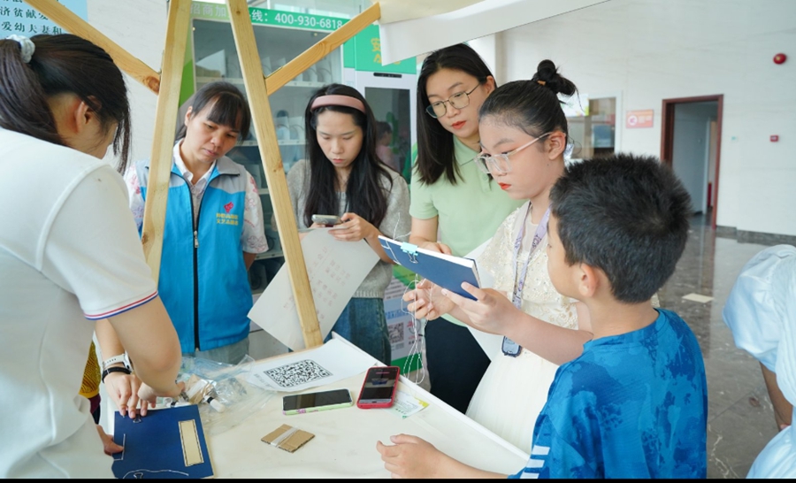 當日,活動現(xiàn)場設置了非遺技藝剪影、雕版印刷體驗、書簽DIY、趣味立體圖書展示、中國郵政·悅讀郵局等互動游戲,家長們帶著孩子流連在各個攤位,體驗非遺文化,感受閱讀魅力。