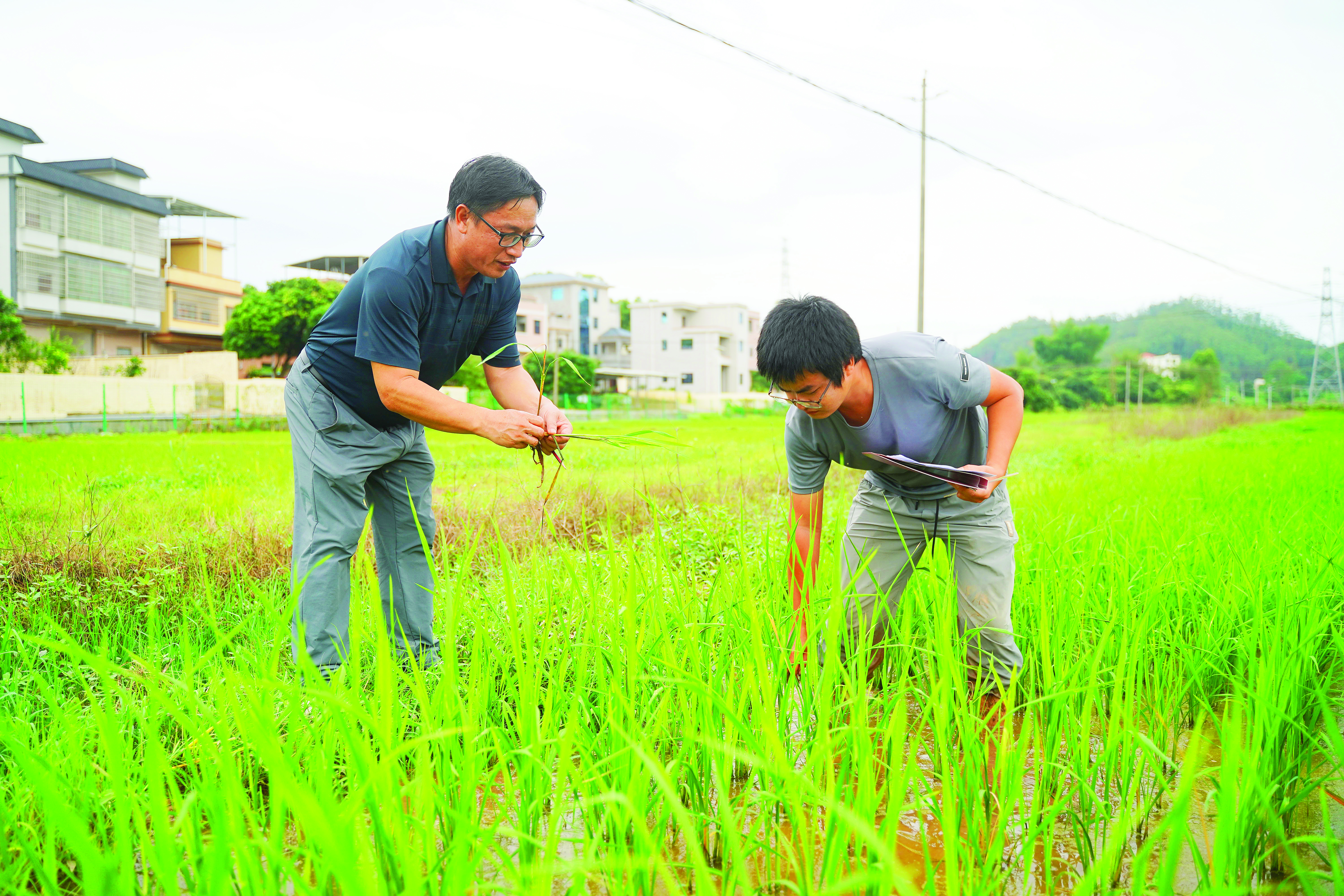 福豐種業(yè)負(fù)責(zé)人劉冠明(左)查看水稻生長情況。 惠州日報記者湯渝杭 攝